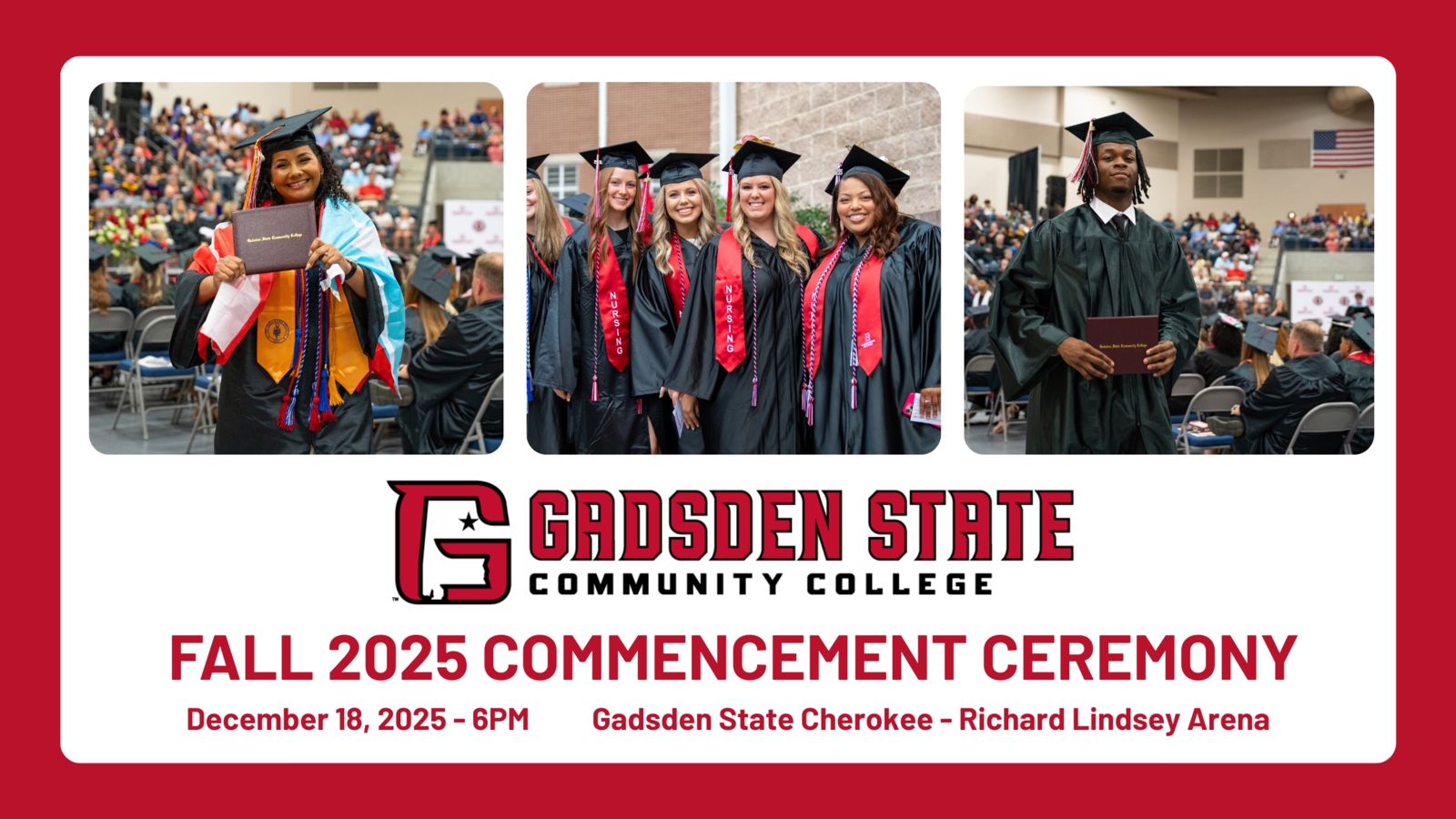 Centre, Ala. – Gadsden State Community College will host its Fall Commencement Ceremony at 6 p.m. Dec. 18 in the Richard Lindsey Arena at Gadsden State Cherokee. The event will recognize students who completed program requirements following the summer and fall semesters.