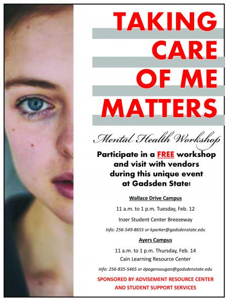 Gadsden State Community College is hosting free workshops focusing on mental health and student success. “Taking Care of Me Matters” will be from 11 a.m. to 1 p.m. Feb. 12 in the Inzer Student Center Breezeway on the Wallace Drive Campus and from 11 a.m. to 1 p.m. on Feb. 14 in the Cain Learning Resource Center on the Ayers Campus.