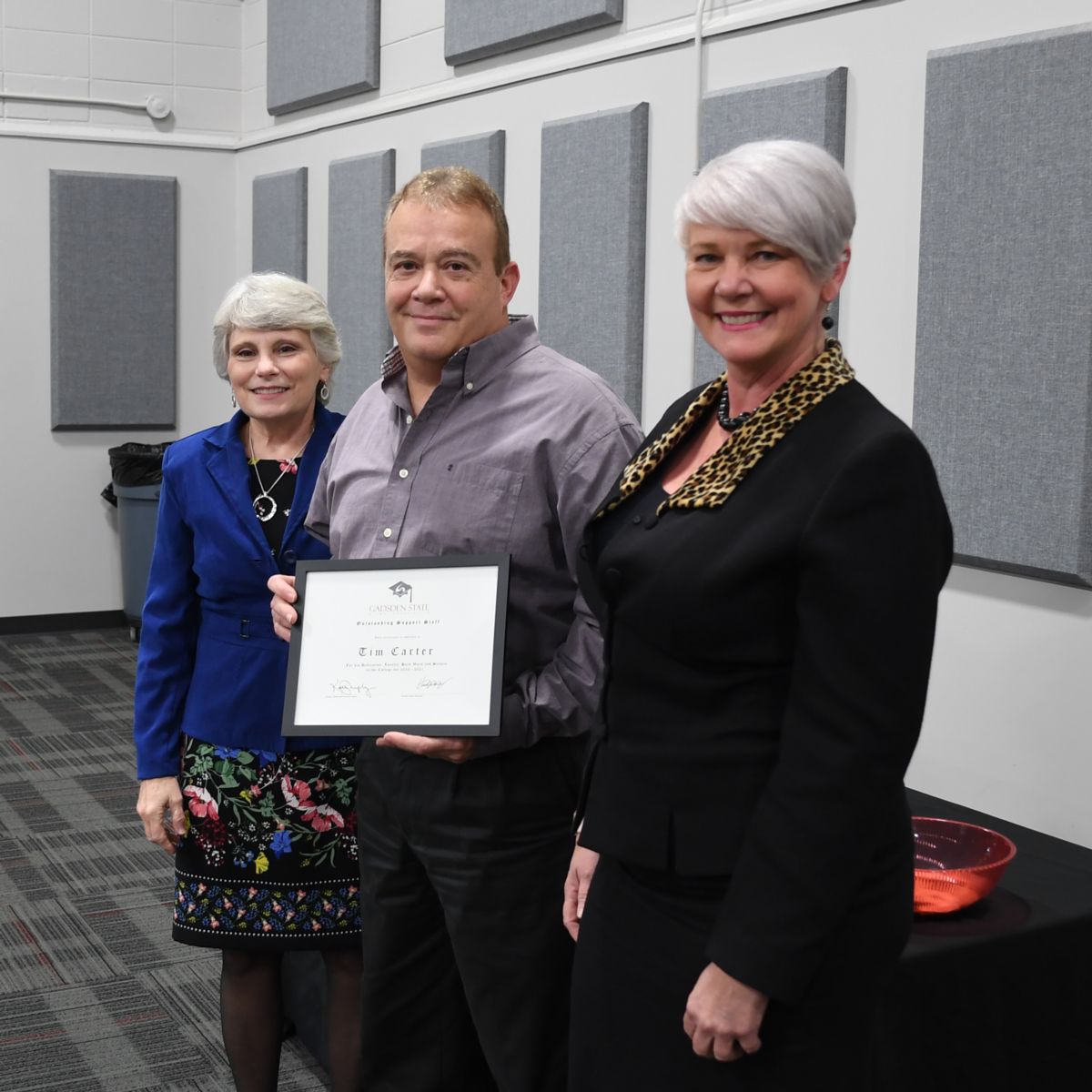 Tim Carter of Rainbow City, center, was awarded the Outstanding Support Staff Award Dec. 16 at the Gadsden State Beck Conference Center. He is pictured with Dr. Kathy Murphy, left, president of Gadsden State, and Heather Brothers New, president of the Gadsden State Alumni Association.