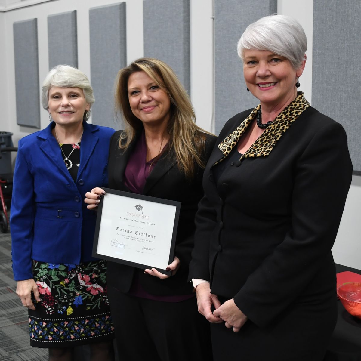 Tarina VanNatta, middle, the FAME program instructor on the Ayers Campus, was awarded the Outstanding Technical Faculty Award Dec. 16 at the Gadsden State Beck Conference Center. She is pictured with Dr. Kathy Murphy, left, president of Gadsden State, and Heather Brothers New, president of the Gadsden State Alumni Association.