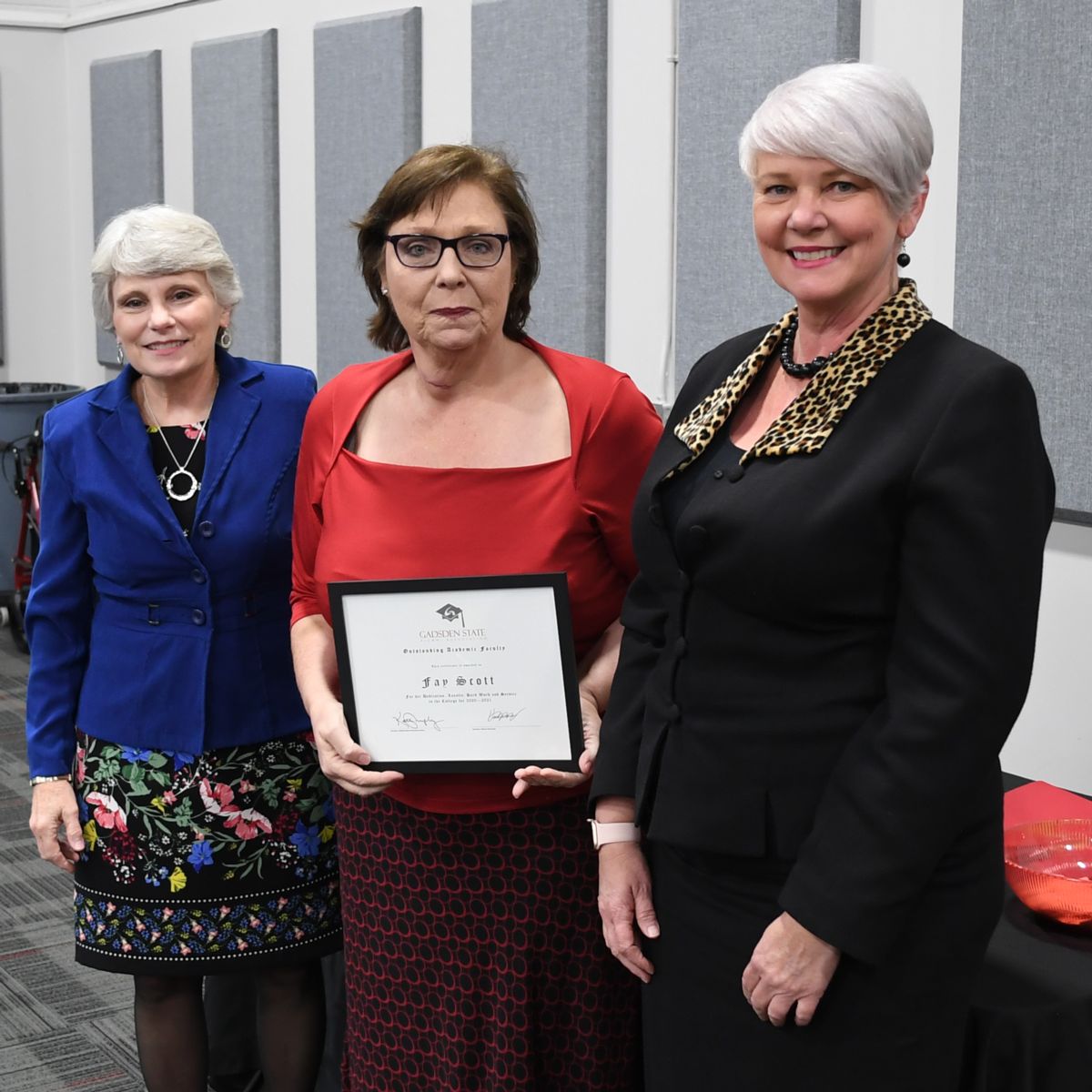Fay Scott of Heflin, center, was awarded the Outstanding Academic Faculty Award Dec. 16 at the Gadsden State Beck Conference Center. She is pictured with Dr. Kathy Murphy, left, president of Gadsden State, and Heather Brothers New, president of the Gadsden State Alumni Association.