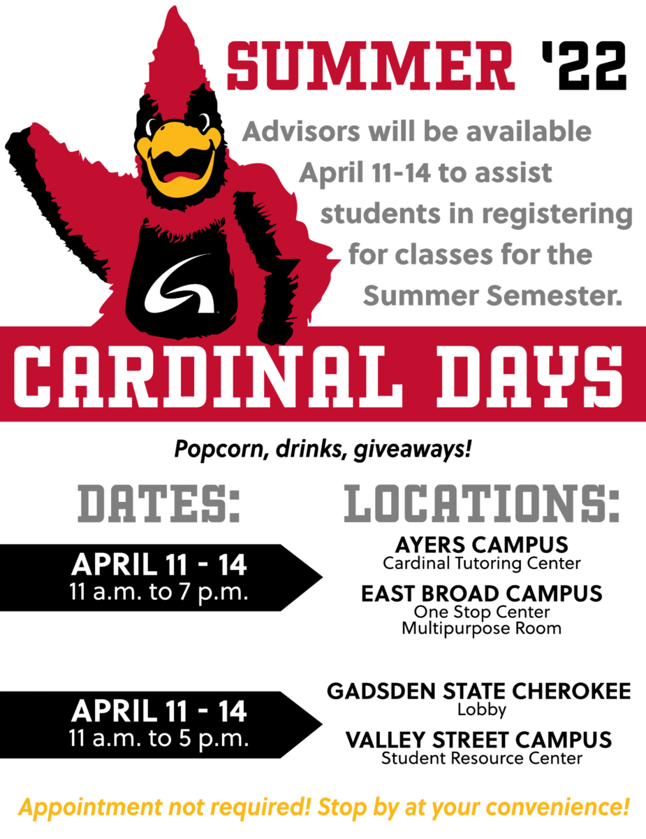 Cardinal Days is scheduled for April 11-14. The event will be from 11 a.m. to 7 p.m. in the Cardinal Tutoring Center on the Ayers Campus in Anniston and in the One Stop Center on the East Broad Campus. It will also be from 11 a.m. to 5 p.m. in the lobby at Gadsden State Cherokee in Centre and in the Student Resource Center on the Valley Street Campus in Gadsden.