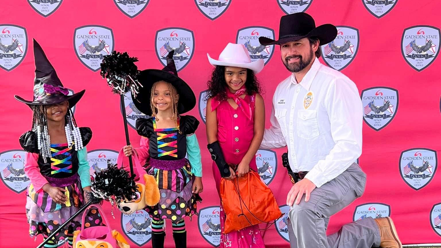 Gadsden State Chief of Police poses with trick-or-treaters at the college’s Candy with the Cardinals event in October 2023.