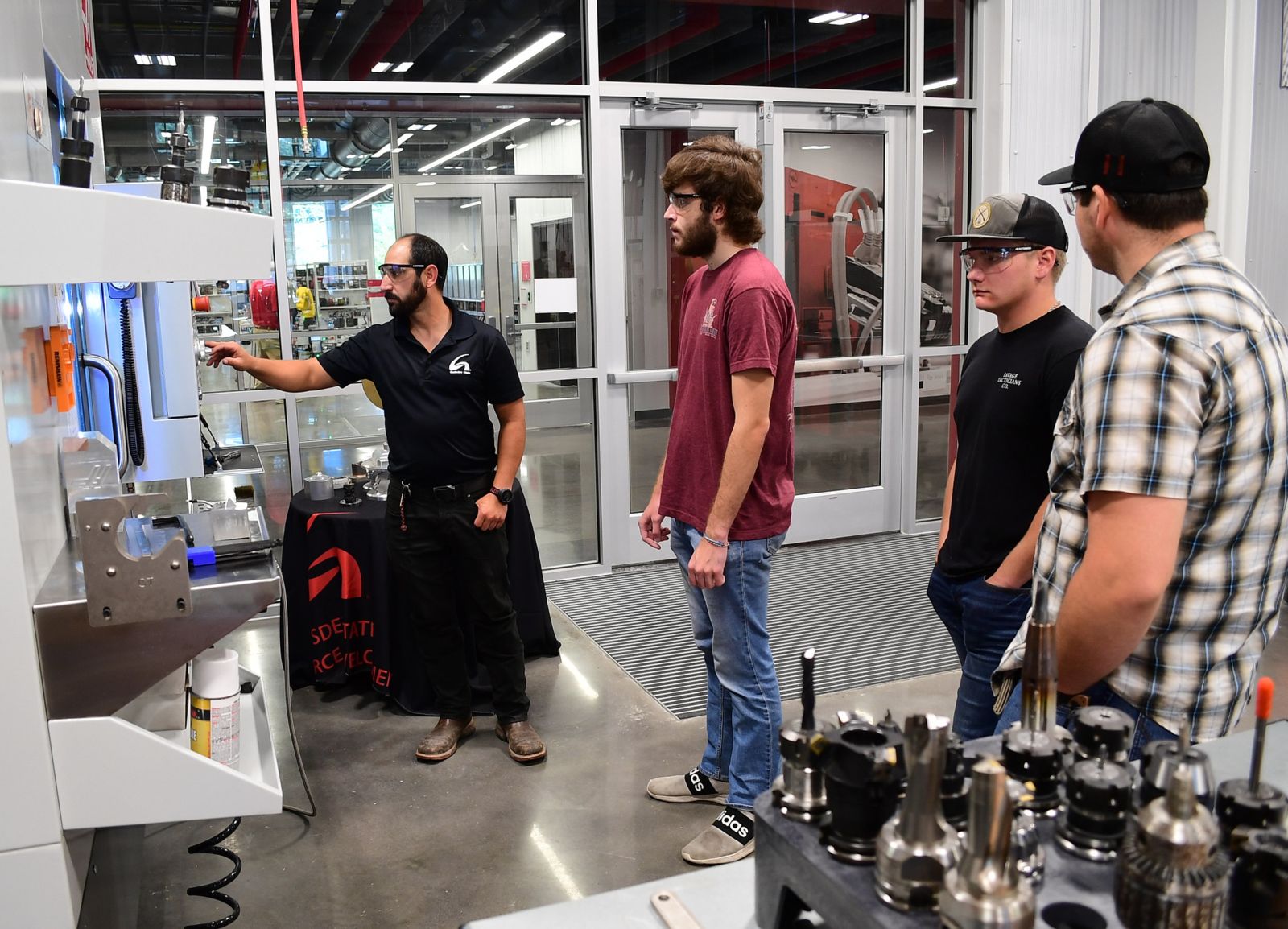 Precision Machining Instructor Daniel Anderson, far left, demonstrates on machining equipment in the Gene Haas Center for Advanced Machining and Engineering Technology. Students are, from left, Thomas Yohe, Harrison Goforth and Justin Bashe.