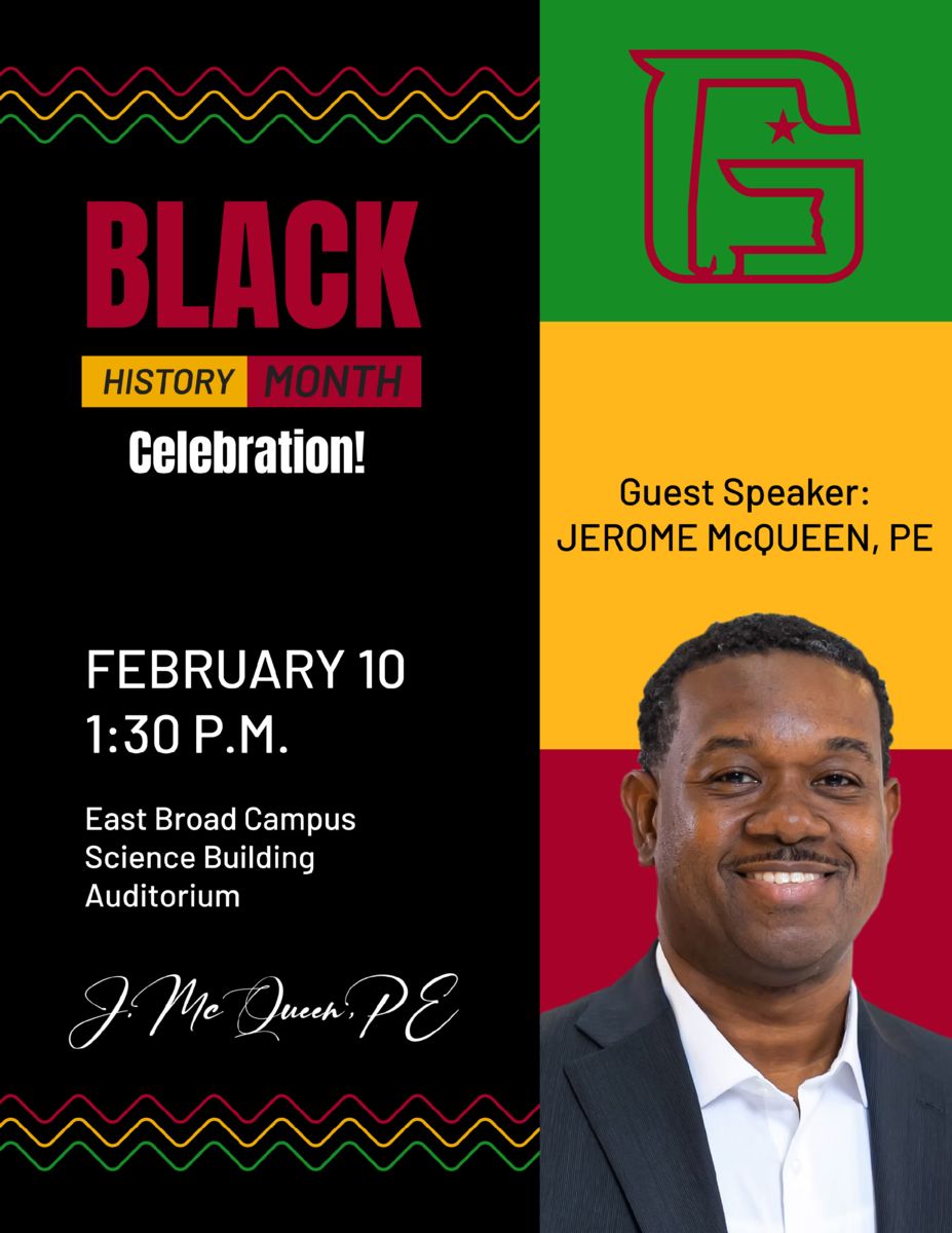 On February 10, 2025, at 1:30 p.m., the East Broad Campus will host a Black History Month Celebration in the Science Building Auditorium. The event will feature Jerome McQueen, PE, as the guest speaker. McQueen, a distinguished professional engineer, will share his insights and experiences on leadership and excellence within the engineering field. This event is open to students, faculty, staff, and the community.