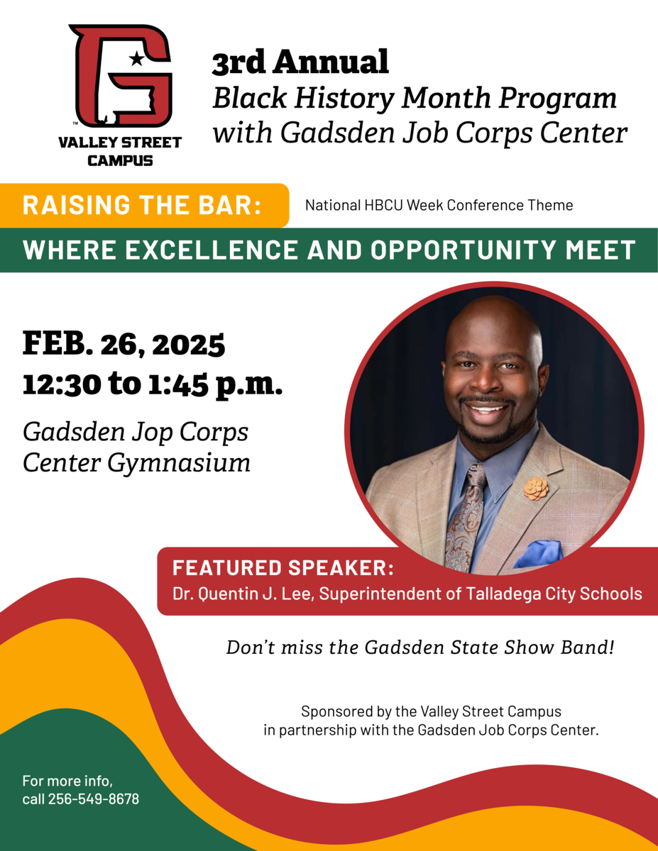 The celebration continues on February 26, 2025, from 12:30 to 1:45 p.m. at the Gadsden Job Corps Center Gymnasium on the Valley Street Campus. This marks the third annual Black History Month Program in partnership with the Gadsden Job Corps Center. This year's program will feature Dr. Quentin J. Lee, Superintendent of Talladega City Schools, as the keynote speaker. Dr. Lee will discuss the National HBCU Week Conference Theme: "Raising the Bar: Where Excellence and Opportunity Meet." Attendees will also enjoy a performance by the renowned Gadsden State Show Band.