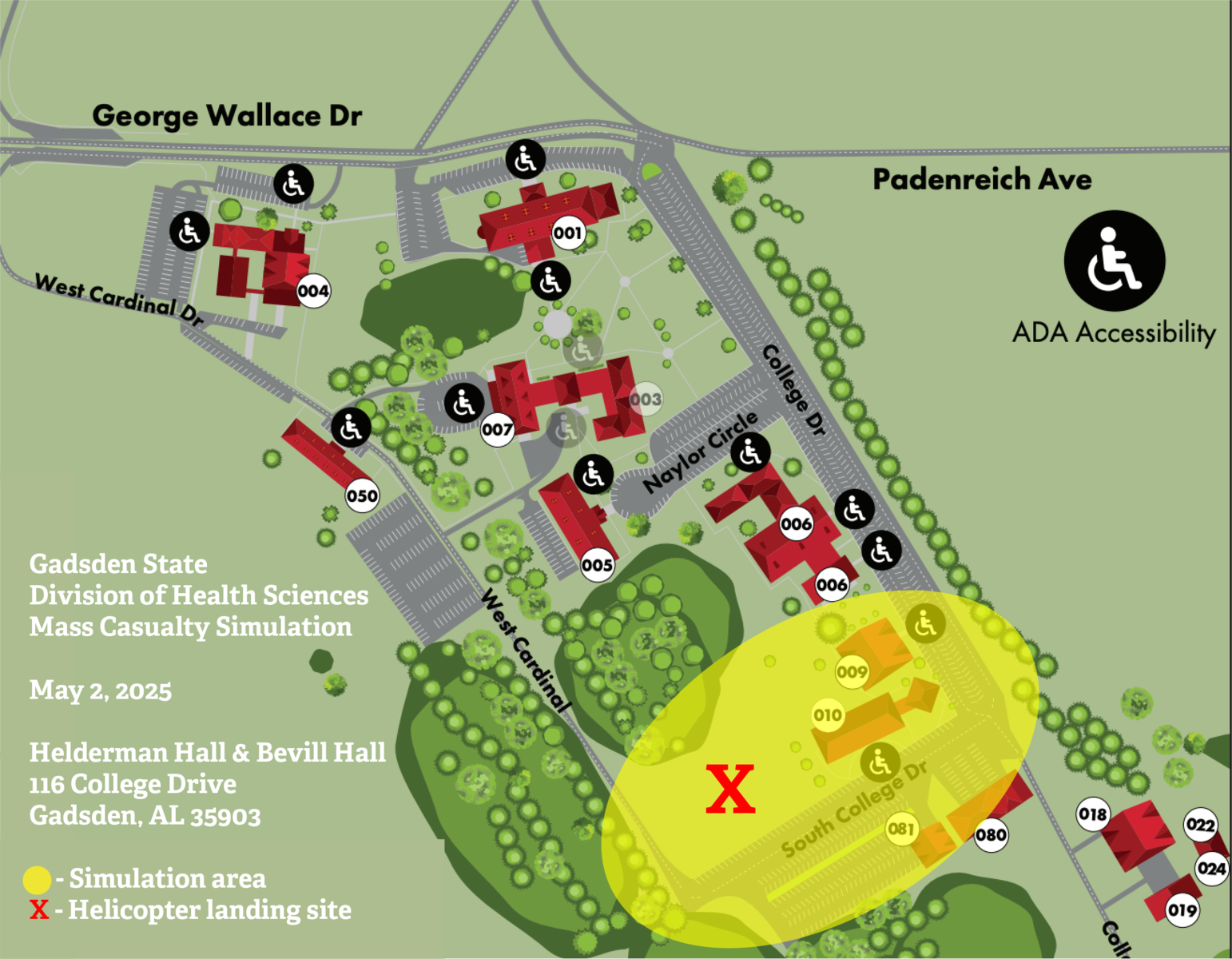 The map shows the area of the Wallace Drive campus where the simulation will be taking place. The Gadsden State Department of Police and Public Safety will secure the area and direct traffic on the day of the event. A helicopter landing is scheduled to occur in the area marked with a red X on the map.