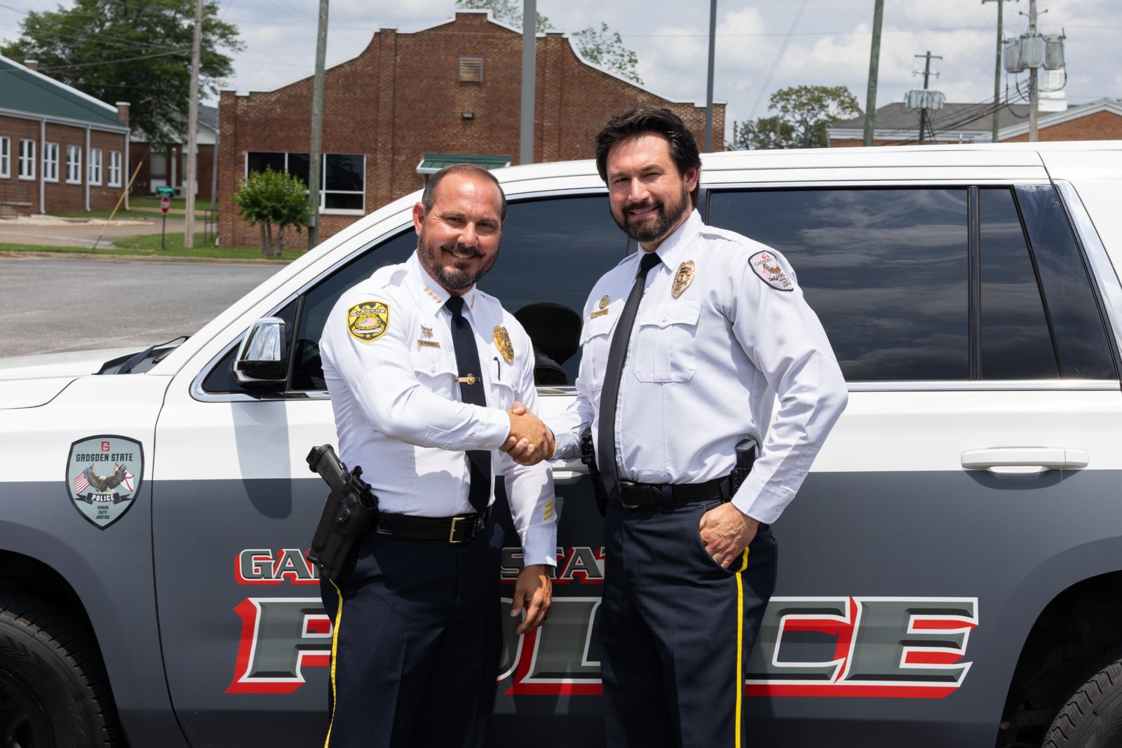 Gadsden State Chief of Police Jay Freeman shakes hands with Glencoe Chief of Police Kenon McKenzie reaffirming both organizations commitment to keeping the local communities safe.