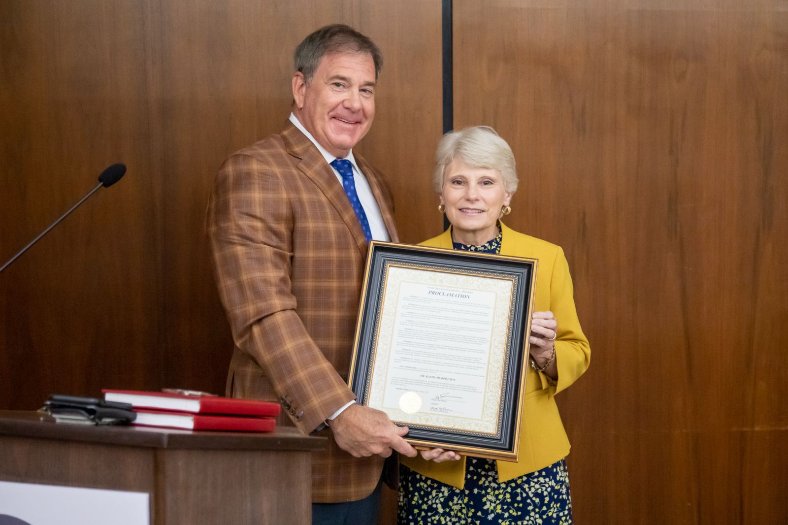 Gadsden Mayor Craig Ford (left) presents the proclamation for Dr. Kathy Murphy Day to Dr. Kathy Murphy (right) at Gadsden City Hall.