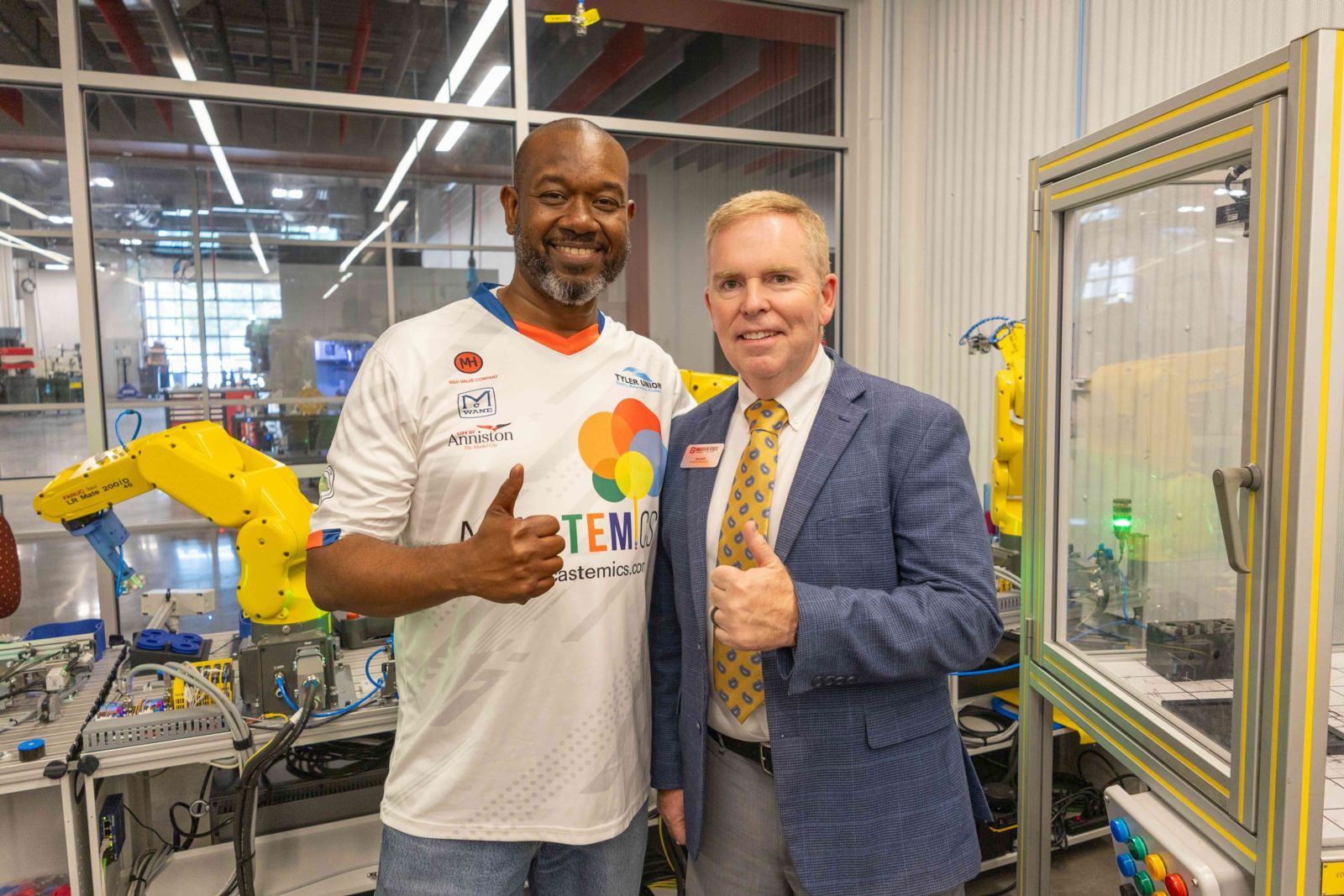 Camp leader Jerome McQueen (left) and Interim President Alan Smith (right) showed students the state of the art technology and equipment available at Gadsden State's Advanced Manufacturing and Workforce Skills Training Center.