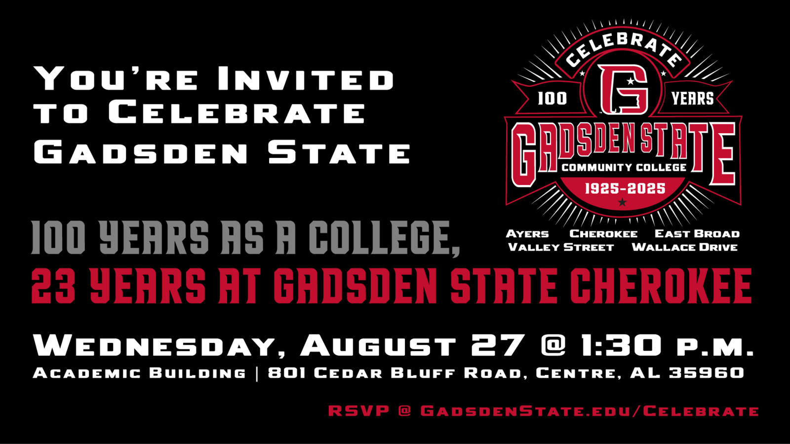 This celebration is part of the “Celebrate Gadsden State” Centennial Campaign, marking 100 years since the college’s founding in 1925. Please RSVP by August 22, 2025 at www.GadsdenState.edu/celebrate.
