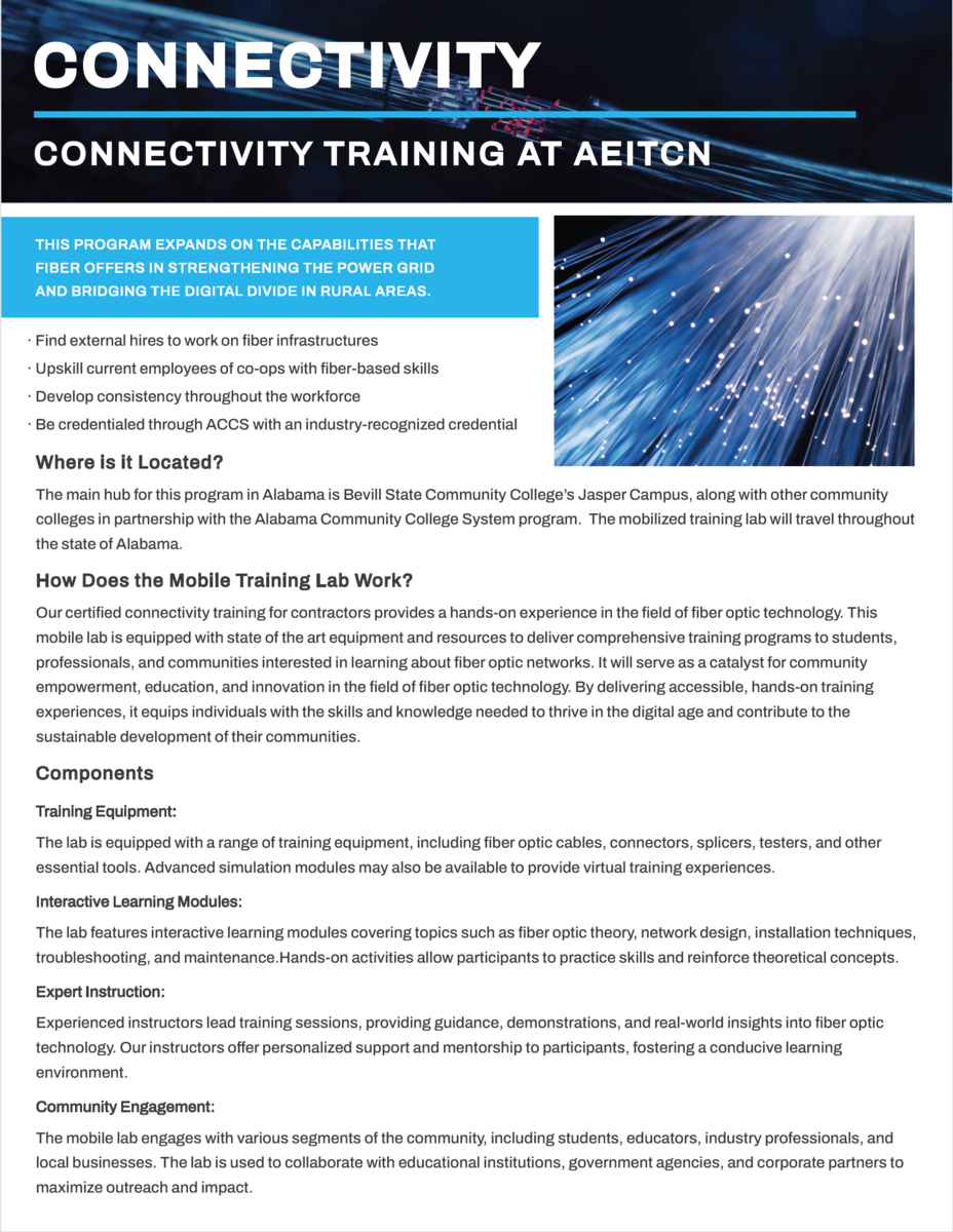 Our certified connectivity training for contractors provides a hands-on experience in the field of fiber optic technology. This mobile lab is equipped with state-of-the-art equipment and resources to deliver comprehensive training programs to students, professionals, and communities interested in learning about fiber optic networks. It will serve as a catalyst for community empowerment, education, and innovation in the field of fiber optic technology. By delivering accessible, hands-on training experiences, it equips individuals with the skills and knowledge needed to thrive in the digital age and contribute to the