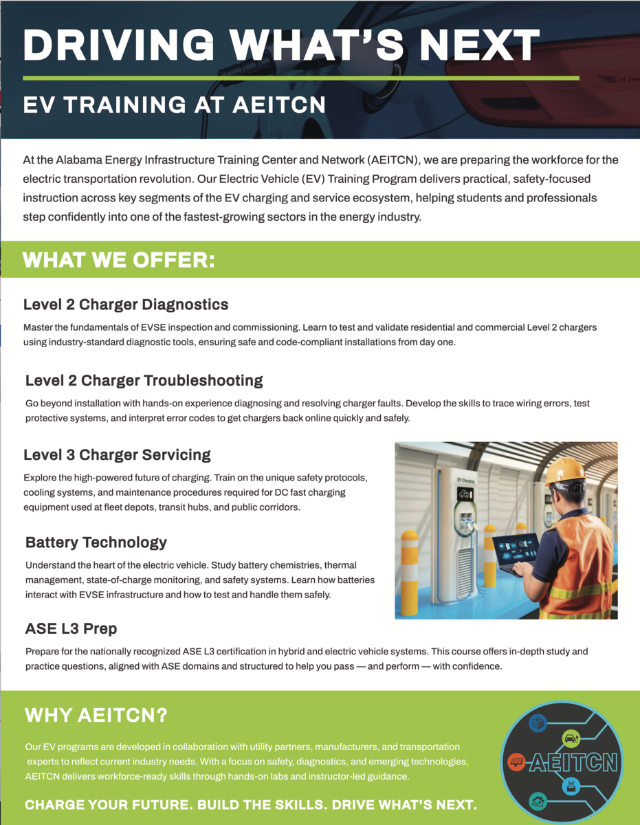 At the Alabama Energy Infrastructure Training Center and Network (AEITCN), we are preparing the workforce for the electric transportation revolution. Our Electric Vehicle (EV) Training Program delivers practical, safety-focused instruction across key segments of the EV charging and service ecosystem, helping students and professionals step confidently into one of the fastest-growing sectors in the energy industry.